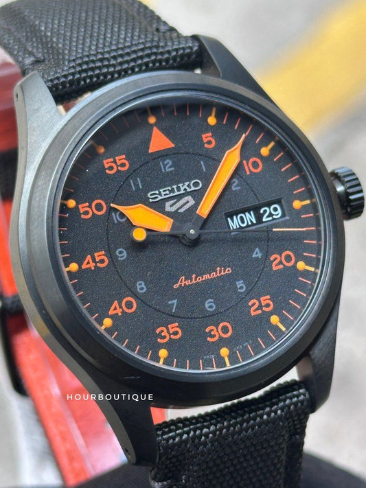 Brand New Seiko 5 PVD Black With Orange Index Automatic Watch SRPH33K1